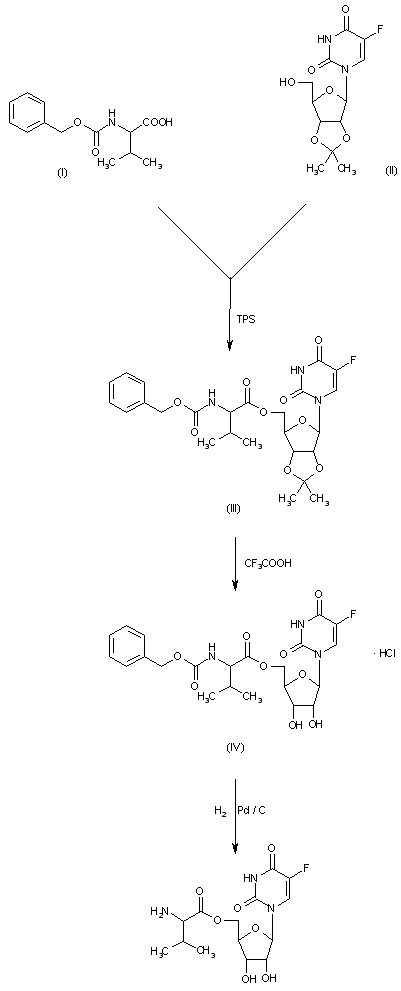 The acylation of 2',3'-O-isopropylidene-5-fluoro-uridine (II) with N-benzyloxycarbonylvaline (I) by means of 2,4,6-triisopropylbenzenesulfonyl chloride (TPS) in pyridine gives 5'-O(N-benzyloxycarbonylvalyl)-2',3'-O-isopropylidene-5-fluorouridine (III), which is treated with trifluoroacetic acid yielding 5'-O-(N-benzyloxycarbonylvalyl)-5-fluorouridine (IV). Finally, this compound is debenzylated by hydrogenation with H2 over Pd/C in isopropanol.