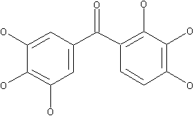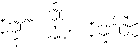 By condensation of 3,4,5-trihydroxybenzoic acid (I) with pyrogallol (II) by means of ZnCl2 in hot POCl3.