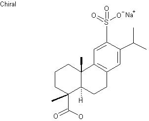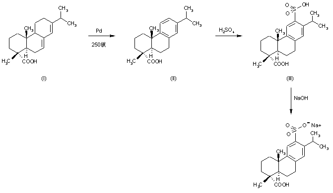 The dehydrogenation of abietic acid (I) over Pd at 250 C gives dehydroabietic acid (II), which is sulfonated with sulfuric acid at -5 C yielding 12-sulfodehydroabietic acid (III). Finally, this compound is neutralized with NaOH in water.