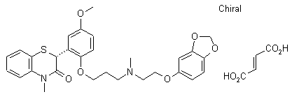 Semotiadil fumarate has been obtained by several related ways: 1) The reaction of 2-(2-hydroxy-5-methoxyphenyl)-4-methyl-3,4-dihydro-2H-1,4-benzothiazin-3-one (I) with 3-chloropropyl bromide (II) by means of NaH in DMF gives 2-[2-(3-bromopropoxy)-5-methoxyphenyl]-4-methyl-3,4-dihydro-2H-1,4-benzothiazin-3-one (III) , which is condensed with N-[2-(1,3-benzodioxol-5-yloxy)ethyl]-N-methylamine (IV) by means of NaI in NaHCO3 in DMF yielding 2-[2-[3-[N-[2-(1,3-benzodioxol-5-yloxy)ethyl]-N-methylamino]propoxy]-5-methoxyphenyl]-4-methyl-3,4-dihydro-2H-1,4-benzothiazin-3-one (V). Finally, this compound is submitted to optical resolution by salification with L-(+)-2-hydroxy-2-phenylacetic acid (VI), fractional crystallization of the resulting salts, elimination of the chiral acid with NaHCO3 and salification with fumaric acid in ethanol. 2) Compound (V) can also be obtained by condensation of benzothiazinone (I) with N-[2-(1,3-benzodioxol-5-yloxy)ethyl]-N-(3-bromopropyl)-N-methylamine (VII) by means of NaH in DMF. 3) Compound (V) can also be obtained by condensation of 2-[5-methoxy-2-[3-(methylamino)propoxy]phenyl]-4-methyl-3,4-dihydro-2H-1,4-benzothiazin-3-one (VIII) with 2-(1,3-benzodioxol-5-yloxy)ethyl methanesulfonate (IX) by means of triethylamine in ethanol. 4) The optical resolution of the racemic compound (V) can also be performed by chromatography over a column packed with crystalline cellulose triacetate eluted with 95% ethanol.