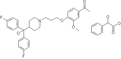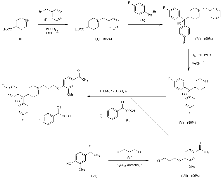 AHR-53338 is synthesized in an overall yield of 62% from ethyl isonipecotate (I): Ethyl isonipecotate (I) is protected with benzyl bromide (II) to give (III), which is then treated with 2.5 moles of 4-fluorophenylmagnesium bromide to give the tertiary alcohol (IV). The benzyl group is removed by catalytic hydrogenolysis to give the secondary piperidine (V). The reaction of 1-bromo-3-chloropropane (VI) with acetovanillone (VII) gives 1-[4-(3-chloropropoxy)-3-methoxyphenyl]ethanone (VIII) in excellent yield. A mixture of (V) and (VIII) in 1-butanol and triethylamine heated at reflux yields AHR-53338 isolated as the mandelic acid salt.