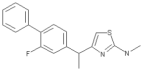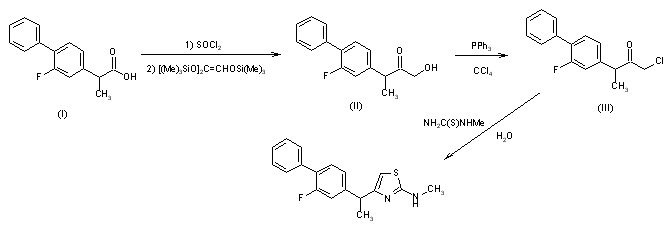 The reaction of 2-(2-fluorobiphenyl-4-yl)propionic acid (I) with thionyl chloride followed by treatment with tris (trimethylsilyloxy)ethylene gives 3-(2-fluorobiphenyl-4-yl)-1-hydroxy-2-butanone (II), which upon treatment with carbon tetrachloride and triphenylphosphine affords 1-chloro-3-(2-fluorobiphenyl-4-yl)-2-butanone (III). Finally, compound (III) is heated with N-methylthiourea in water.