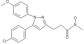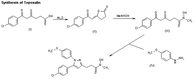 A new synthesis of tepoxalin has been described: The condensation of 4-chloroacetophenone (I) with succinic anhydride (II) by means of lithium bis(trimethylsilyl)amide in THF at -20 C gives 6-(4-chlorophenyl)-4,6-dioxohexanoic acid (III), which is cyclized with 4-methoxyphenylhydrazine (IV) by means of triethylamine in methanol at room temperature to afford 3-[5-(4-chlorophenyl)-1-(4-methoxyphenyl)pyrazol-3-yl]propanoic acid (V); finally this compound is condensed with methylhydroxylamine (VI) by means of oxalyl chloride and triethylamine at room temperature.