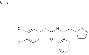 N-(Methoxycarbonyl)-(S)-phenylglycine (I) was converted to amide (III) by coupling with pyrrolidine (II) by means of DCC and HOBT. Simultaneous reduction of both carbamoyl and amide functions of (III) using excess LiAlH4 in THF gave the chiral diamine (IV). Final acylation of (IV) with (3,4-dichlorophenyl)acetyl chloride (V) in CH2Cl2 yielded the target amide.