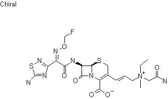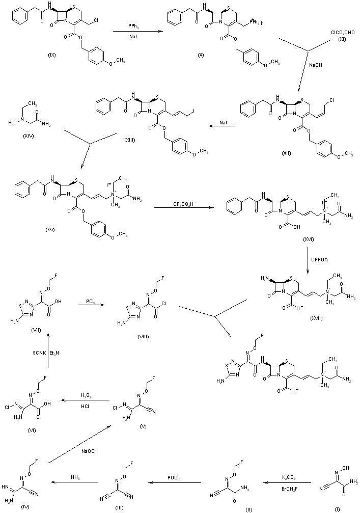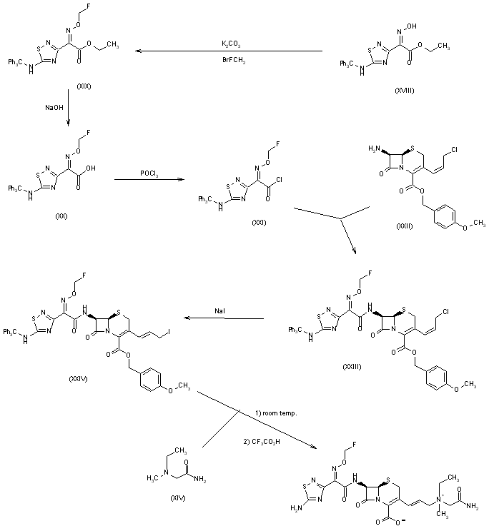 This compound can be obtained by two related ways: A) By condensation of 2-(5-amino-1,2,4-thiadiazol-3-yl)-2(Z)-(fluoromethoxyimino)acetyl chloride (VIII) with (6R,7R)-7-amino-3-[3-[N-(carbamoylmethyl)-N-ethyl-N-methylammonio]- 1(E)-propenyl]-3-cephem-4-carboxylate (XVII) by means of sodium acetate in methanol - water. The starting products (VIII) and (XVIII) are obtained as follows: 1) The reaction of 2-cyano-2-(hydroxyimino)acetamide (I) with bromofluoromethane by means of K2CO3 in DMSO - DMF gives 2-cyano-2-(fluoromethoxyimino)acetamide (II), which is dehydrated with refluxing POCl3 to yield 2-(fluoromethoxyimino)propanedinitrile (III). The amonolysis of (III) with aqueous NH3 and ethanol affords 2-cyano-2-(fluoromethoxyimino)acetamidine (IV), which is chlorinated with aqueous NaOCl in methanol - ether giving 2-(N2-chloroamidino)-2-(fluoromethoxyimino)acetonitrile (V). The hydrolysis of (V) with H2O2 and HCl in water yields 2-(N2-chloroamidino)-2-(fluoromethoxyimino)acetic acid (VI), which is cyclized with potassium thiocyanate by means of triethylamine in methanol to afford 2-(5-amino-1,2,4-thiadiazol-3-yl)-2(Z)-fluoromethoxyimino)acetic acid (VII). Finally, this compound is converted into the desired acyl chloride (VIII) by reaction with PCl5 in dichloromethane. 2) The reaction of 3-(chloromethyl)-7beta-(2-phenylacetamido)-3-cephem-4-carboxylic acid 4-methoxybenzyl ester (IX) with triphenylphosphine and sodium iodide in acetone gives the corresponding phosphonium salt (X), which is condensed with chloroacetaldehyde (XI) to yield the 3-chloropropenyl derivative (XII). The reaction of (XII) with NaI in dry acetone affords the corresponding iodo derivative (XIII), which is condensed with N-ethyl-N-methylglycinamide (XIV) to give 3-[3-[N-(carbamoylmethyl)-N-ethyl-N-methylammonio]-1(E)-propenyl]-7beta-(phenylacetamido)-3-cephem-4-carboxylic acid 4-methoxybenzyl ester iodide (XV). The partial hydrolysis of (XV) with trifluoroacetic acid in anisole yields the inner salt (XVI), which is treated with Carrier-Fixed-Penicillin G Amidase in water at pH 7.5-8.0 to obtain the desired 7-amino derivative (XVII).