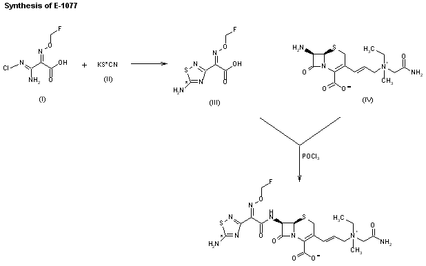 The synthesis of [14C]-labeled E-1077 has been described: The cyclization of 2-(N-chloroamidino)-2(Z)-(fluoromethoxyimino)acetic acid (I) with [14C]-potassium thiocyanate (II) in methanol gives labeled 2-(5-amino-1,2,4-thiadiazol-3-yl)-2(Z)-(fluoromethoxyimino)acetic acid (III), which is then condensed with (6R,7R)-7-amino-3-[3-[N-(carbamoylmethyl)-N-ethyl-N-methylammonium]-1(E)-propenyl]-3-cephem-4-carboxylate (IV) by means of POCl3 in DMF.