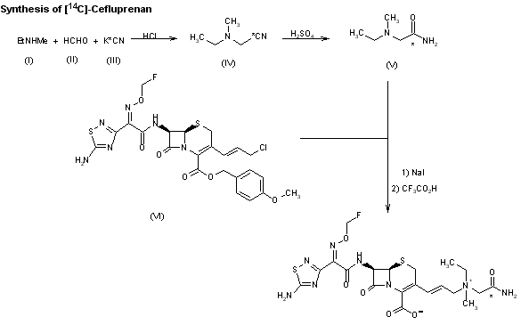 The synthesis of [14C]-labeled cefluprenam has been described: The condensation of methyl ethylamine (I) with aqueous formaldehyde (II) and [14C]-labeled potassium cyanide (III) by means of HCl gives labeled 2-(N-ethyl-N-methylamino)acetonitrile (IV), which by partial hydrolysis with concentrated H2SO4 is converted to the acetamide (V). Finally, this compound is condensed with (6R,7R)-7-[2-(5-amino-1,2,4-thiadiazol-3-yl)-2(Z)-(fluoromethoxyimino)a cetamido]-3-[3-chloro-1(E)-propenyl]-3-cephem-4-carboxylic acid 4-methoxybenzyl ester (VI) by means of NaI in DMF, and deprotected with trifluoroacetic acid-anisole.