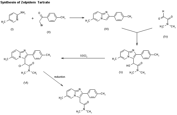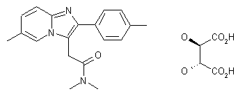 N,N-Dimethyl-4-(4-methylphenyl)-4-oxobutyramide (I) with Br2 in HOAc gives the 3-bromo derivative (II), which is cyclized with 5-methylpyridine-2-amine (III) in either hot acetonitrile or 1,3-dimethyl-2-imidazolidinone to afford the imidazo-pyridine derivative (IV). Finally, the semitartrate salt is obtained by treatment of (IV) with tartaric acid in MeOH. Alternatively, the conversion of N,N-Dimethyl-4-(4-methylphenyl)-4-oxobutyramide (I) into the imidazo-pyridine derivative (IV) can be directly performed by first refluxing of (I) with HBr in dichloromethane, followed by reaction with Br2 and final treatment with a solution of 5-methylpyridine-2-amine (III) in acetonitrile.