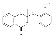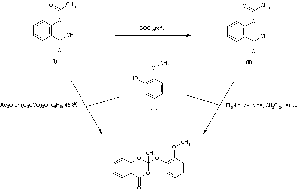 Acetylsalicylic acid (I) was converted to acid chloride (II) by refluxing in a SOCl2 solution. Condensation of acid chloride (II) with guaiacol (III) either in the absence or in the presence of tertiary amines gave rise to the target orthoester derivative. Alternatively, the title compound has been prepared by treatment of acetylsalicylic acid (I) with several acid anhydrides, followed by guaiacol (III).
