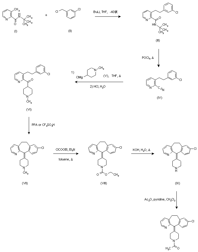 N-tert-Butyl-3-methyl-2-pyridinecarboxamide (I) was treated with two equivalents of butyllithium at -40 C, and the resulting dianion was C-alkylated with 3-chlorobenzyl chloride (II) to provide the phenetylpyridine (III). Further refluxing with phosphoryl chloride afforded nitrile (IV), which was condensed with the piperidinyl Grignard reagent (V) to yield, after hydrolysis, ketone (VI). Acid-catalyzed cyclization of ketone (VI) produced the tricyclic compound (VII). Demethylation was then accomplished by conversion to the ethyl carbamate (VIII) by treatment with ethyl chloroformate, followed by hydrolysis to the N-unsubstituted piperidine (IX). Finally, acetylation of (IX) in the presence of pyridine provided the target amide.