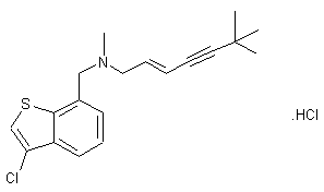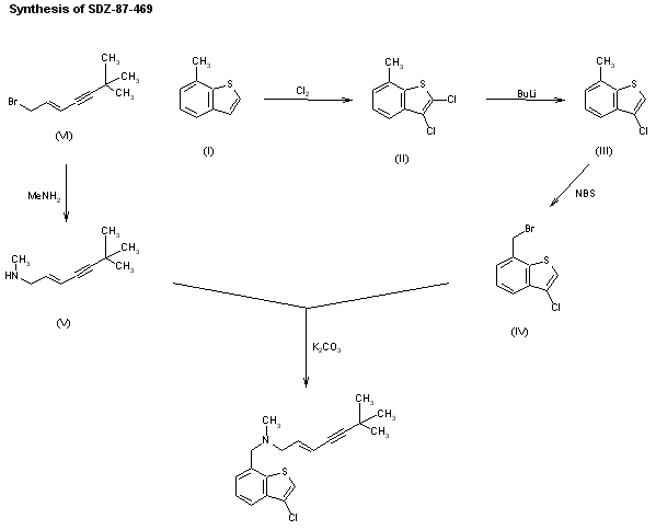 A new synthesis of SDZ-87469 has been published: The chlorination of 7-methylbenzo[b]thiophene (I) gives 2,3-dichloro-7-methylbenzo[b]thiophene (II), which is selectively dechlorinated with butyllithium and hydrolysis, yielding 3-chloro-7-methylbenzo[b]thiophene (III). The bromination of (III) with N-bromosuccinimide (NBS) in DMF affords 7-(bromomethyl)-3-chlorobenzo[b]thiophene (IV), which is finally condensed with N,6,6-trimethylhep-2-en-4-yn-1-amine (V) (E + Z mixture) by means of K2CO3 in DMF. The pure E-isomer is obtained by crystallization of the E + Z mixture of the hydrochlorides in ethanol. Amine (V) is obtained by reaction of the corresponding bromo derivative (IV) with methylamine.