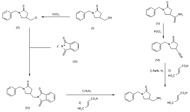 This compound can be prepared by two different ways: 1) The reaction of 1-benzyl-4-(hydroxymethyl)pyrrolidin-2-one (I) with SOCl2 in refluxing dichloromethane gives 1-benzyl-4-(chloromethyl)pyrrolidin-2-one (II), which is condensed with potassium phthalimide (III) in DMF yielding 1-benzyl-4-(phthalimidomethyl)pyrrolidin-2-one (IV). Finally, this compound is treated with hydrazine in ethanol and neutralized with fumaric acid. 2) The dehydration of 1-benzyl-2-oxo-pyrrolidine-4-carboxamide (V) with POCl3 in hot DMF gives 1-benzyl-4-cyanopyrrolidine-2-one (VI), which is reduced with H2 and RaNi in methanol - NH3 and neutralized with fumaric acid.