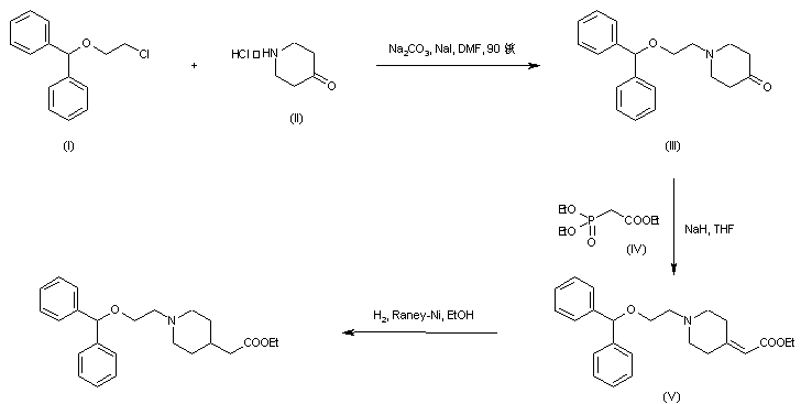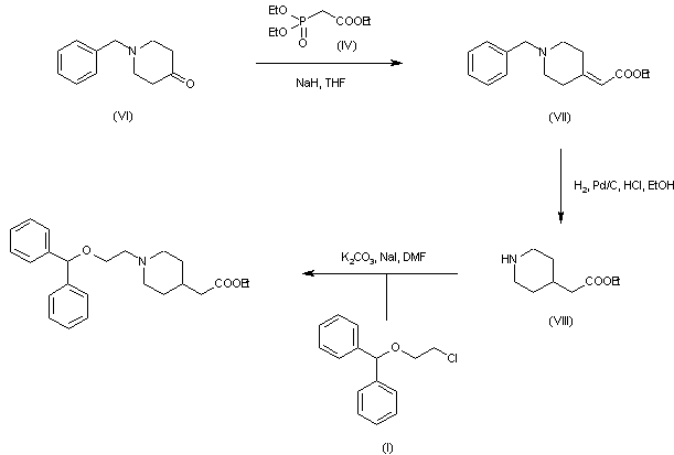 The title compound was obtained by two related procedures. Reaction of 4-piperidone-HCl (II) with 2-(benzhydryloxy)ethyl chloride (I) in the presence of Na2CO3 and NaI provided the N-alkylated piperidone (III). Horner-Emmons condensation of (III) with triethyl phosphonoacetate (IV) and NaH gave rise to the piperidylidene acetate (V). Then, hydrogenation of the double bond of (V) using Raney Nickel yielded the target compound.