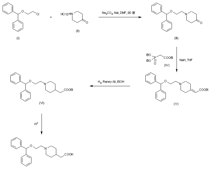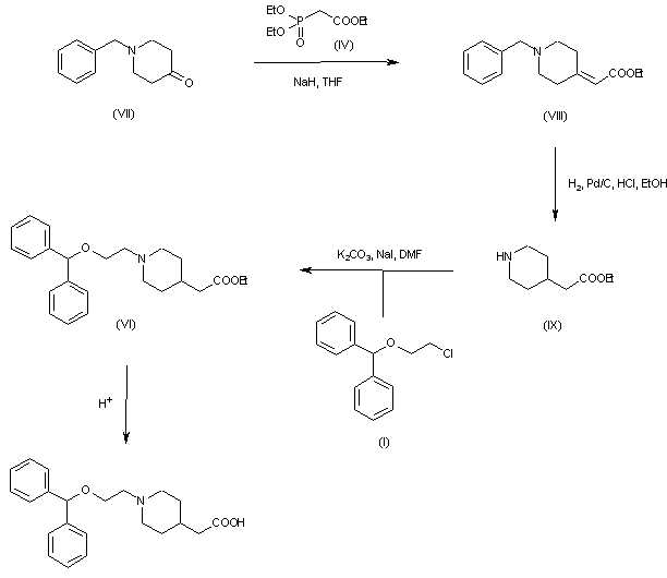 The title compound was obtained by two related procedures. Reaction of 4-piperidone-HCl (II) with 2-(benzhydryloxy)ethyl chloride (I) in the presence of Na2CO3 and NaI provided the N-alkylated piperidone (III). Horner-Emmons condensation of (III) with triethyl phosphonoacetate (IV) and NaH gave rise to the piperidylidene acetate (V). Then, hydrogenation of the double bond of (V) using Raney Nickel and hydrolysis yielded the target compound.
