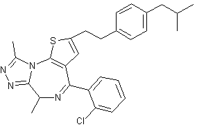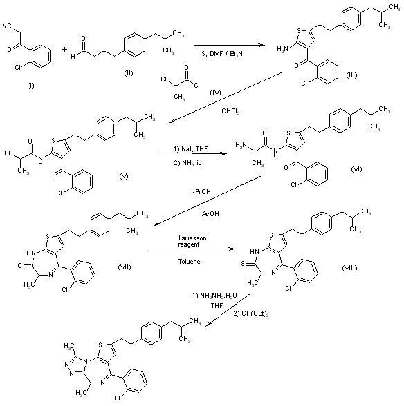Reaction of 2-(2-chlorobenzoyl)acetonitrile (I) with 4-(4-isobutylphenyl)butyraldehyde (II) and sulfur in DMF/NEt3 gives 2-amino-3-(2-chlorobenzoyl)-5-[2-(4-isobutylphenyl)ethyl]thiophene (III), which is acylated with 2-chloropropionyl chloride (IV) in chloroform to give 2-(2-chloropropionamido)-3-(2-chlorobenzoyl)-5-[2-(4-isobutylphenyl) ethyl]thiophene (V). Compound (V) is treated with sodium iodide in THF followed by liquid ammonia to give 2-(2-aminopropionamido)-3-(2-chlorobenzoyl)-5-[2-(4-isobutylphenyl) ethyl]thiophene (VI), which is cyclized in isopropanol and acetic acid to give 5-(2-chlorophenyl)-5-[2-(4-isobutylphenyl)ethyl]-3-methyl-2,3-dihydro-1H-thieno[2,3-e]-1,4-diazepin-2-one (VII). Compound (VII) gives 5-(2-chlorophenyl)-7-[2-(4-isobutylphenyl)ethyl]-3-methyl-2,3-dihydro-1H-thieno[2,3-e]-1,4-diazepin-2-thione (VIII) upon treatment with Lawesson's reagent. Finally, (VIII) is cyclized with hydrazine hydrate and ethyl orthoformiate.
