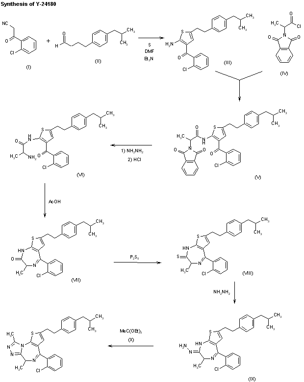 A new synthesis of Y-24180 has been published: The reaction of 2-(2-chlorobenzoyl)acetonitrile (I) with 4-(4-isobutylphenyl)butyraldehyde (II) and sulfur by means of triethylamine in DMF gives the benzoylthiophene (III), which is condensed with 2-phthalimidopropionyl chloride (IV) yielding the propionamidothiophene (V). Elimination of the phthalimido group of (V) first with hydrazine and then with HCl affords the alanylaminothiophene (VI), which is cyclized by means of acetic acid giving 5-(2-chlorophenyl)-7-[2-(4-isobutylphenyl)ethyl]-3-methyl-2,3-dihydro-1 H-thieno[3,2-f][1,4]diazepin-2-one (VII). The reaction of (VII) with P2S5 yields the corresponding thioketone (VIII), which by reaction with hydrazine is converted into the hydrazone (IX). Finally, this compound is cyclized with triethyl orthoacetate (X).