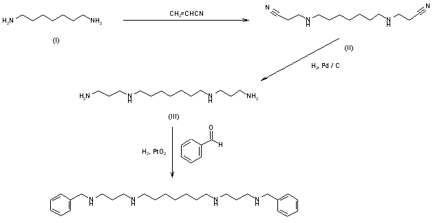 Reaction of 1,7-diaminoheptane with acrylonitrile gives the dinitrile (II). Reduction of the nitrile functionality yields the tetraamine (III). Reductive alkylation gives the dibenzyltetraamine MDL 27,695.