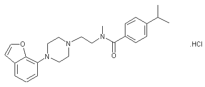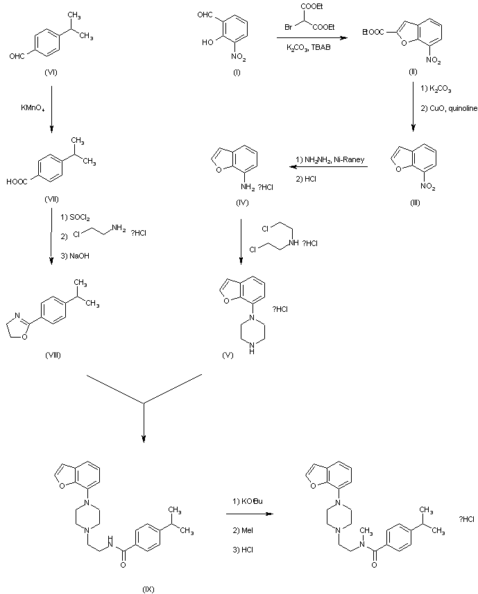 | 合成路线图解说明: The synthesis of the heteroarylpiperazine part of the molecule begins with 3-nitrosalicylaldehyde (I). Alkylation with diethyl bromomalonate under phase transfer conditions immediately gives the cyclized nitrobenzofuran ethyl ester (II), which is converted to 7-nitrobenzofuran (III) by saponification followed by copper-catalyzed decarboxylation. After chemoselective reduction with hydrazine/Raney Nickel to afford aniline (IV), the benzofuranylpiperazine (V) is obtained by reaction with bis(chloroethyl)amine and isolated as the hydrochloride salt. The benzamide part of befiperide is prepared starting from cumenealdehyde (VI). Permanganate oxidation attords the corresponding carboxylic acid (VII), which is converted to oxazoline (VIII) by a one-pot procedure consisting of consecutive treatment with thionyl chloride, chloroethylamine and sodium hydroxide. Coupling of (V) and (VIII) gives the secondary benzamide (IX), which is converted to befiperide hydrochloride by reaction with potassium tert-butylate, N-methylation of the resulting anion with methyliodide and treatment with hydrochloric acid. |