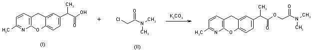 By esterification of 2-(2-methyl-5H-[1]-benzopyrano[2,3-b]pyridin-7-yl)propionic acid (I) with 2-chloro-N,N-dimethylacetamide (II) by means of K2CO3 in hot DMF.