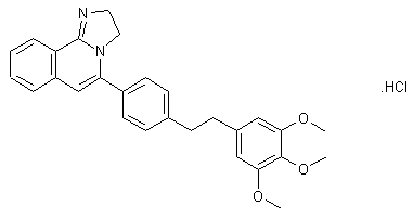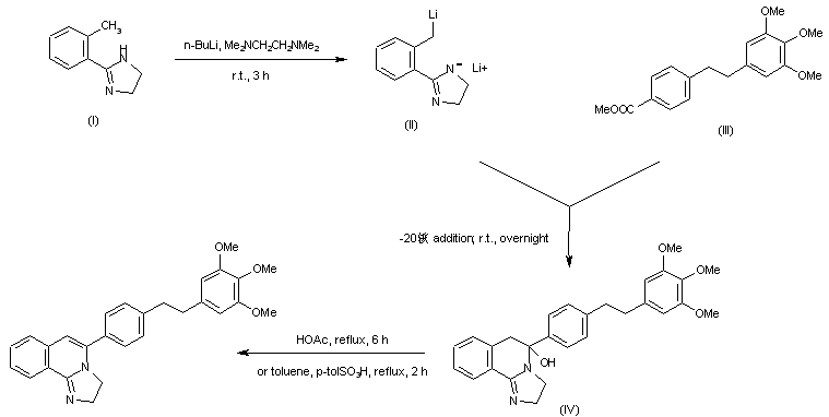 The reaction of 2-(2-methylphenyl)-4,5-dihydro-1H-imidazole (I) with n-BuLi in tetramethylethylenediamine gives the dilithium salt (II), which is cyclized with 4-[2-(3,4,5-trimethoxyphenyl)ethyl]benzoic acid methyl ester (III), yielding imidazoquinoline (IV). Finally, this compound is dehydrated in refluxing acetic acid or in refluxing toluene catalyzed by p-toluenesulfonic acid.