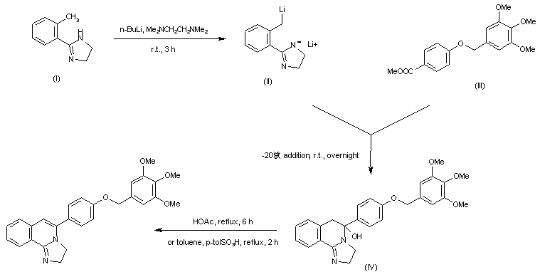 The reaction of 2-(2-methylphenyl)-4,5-dihydro-1H-imidazole (I) with n-BuLi in tetramethylethylenediamine gives the dilithium salt (II), which is cyclized with 4-(3,4,5-trimethoxybenzyloxy)benzoic acid methyl ester (III), yielding imidazoquinoline (IV). Finally, this compound is dehydrated in refluxing acetic acid or in refluxing toluene catalyzed by p-toluenesulfonic acid.