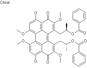 The bromination of 3,5-dimethoxybenzyl alcohol (I) with NBS gives 2-bromo-3,5-dimethoxybenzyl alcohol (II), which is treated with I2 and triphenylphosphine to yield the benzyl iodide (III). The reaction of (III) with triethyl phosphite affords the phosphonate (IV), which is condensed with the silylated aldehyde (V) by means of lithium hexamethyldisylazide (LiHMDS) giving the silylated pentenol (VI). The reaction of (VI) with chromium hexacarbonyl and BuLi provides the organochromium derivative (VII), which is cyclized with tert-butyl isocyanide and TBAF to afford the naphthalene (VIII). The benzoylation of the OH group of (VIII) with benzoyl chloride gives the benzoate (IX), which is oxidized with dichlorodicyanobenzoquinone (DDQ) to yield the naphthoquinone (X). The oxidative cyclization of (X) with O2 and TFA affords the pentacyclic quinone as a mixture of isomers that was thermally equilibrated to a 3:1 mixture of the desired isomer (XI) (the undesired isomer was recycled).The methylation of (XI) with methyl iodide and TBAF gives the fully methylated perylenequinone (XII), which is selectively demethylated with MgI2 to afford the target Calpostin A.