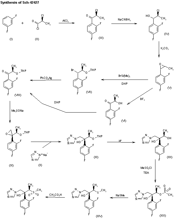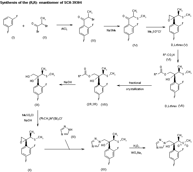 A synthesis of Sch-42427, the active (RR)-enantiomer of Sch-39304, has been published: The condensation of 1,3-difluorobenzene (I) with (S)-2-chloropropionyl chloride (II) by means of AlCl3 gives 2(S)-chloro-1-(2,4-difluorophenyl)-1-propanone (III), which is reduced with NaCNBH3 to the corresponding alcohol (IV). Epoxidation of (IV) with K2CO3 in methanol yields the chiral epoxide (V). The oxidative opening of (V) by means of BF3 in DMSO affords (R)-1-(2,4-difluorophenyl)-2-hydroxypropanone (VI), which is protected with dihydropyran (DHP) and p-toluenesulfonic acid to the tetrahydropyranyl ether (VIII). Alternatively, the treatment of (V) with trimethylsilyl bromide and dihydropyran gives the (R)-bromo-tetrahydropyranyl ether (VII), which can be oxidized to (VIII) with silver benzoate. The reaction of (VIII) with sodium dimethylsulfoxonium methylide in THF gives the epoxide (IX), which is opened with sodium 1,2,4-triazole (X) to yield the semi-protected diol (XI). Hydrolysis of (XI) in acidic medium affords the diol (XII), which is treated with methanesulfonyl chloride and triethylamine to afford the mono methanesulfonyl ester (XIII). The reaction of (XIII) with sodium methyl mercaptane gives the thioether (XIV), which is finally oxidized with peracetic acid.