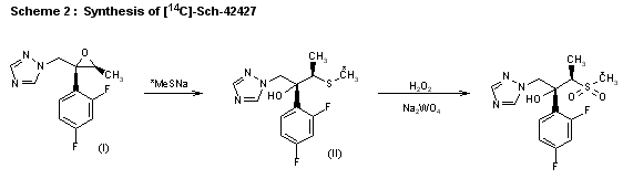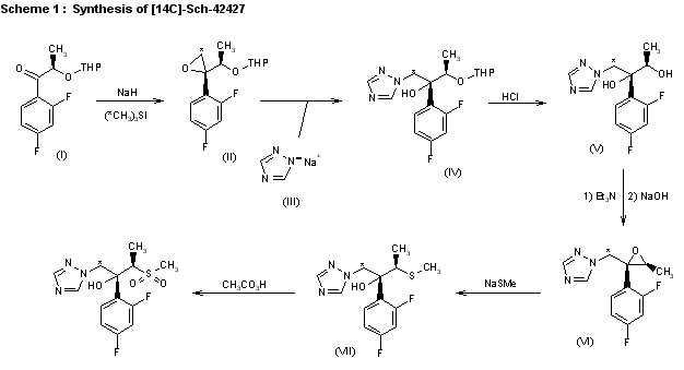 The synthesis of [14C]-labeled Sch-42427 labeled in two different positions, i.e., threo-2(R)-(2,4-difluorophenyl)-3(R)-(methylsulfonyl)-1-(1H-1,2,4-triaz ol-1-yl)[1-14C]-butan-2-ol and threo-2(R)-(2,4-difluorophenyl)-3(R)-[[14C]-methylsulfonyl]-1-(1H-1,2,4-triazol-1-yl)butan-2-ol, has been reported: The condensation of 2,4-difluoro-alpha-(tetrahydroypranyloxy)propiophenone (I) with [14C]-trimethylsulfoxonium iodide by means of NaH in DMSO yields the labeled epoxide (II), which is condensed with sodium 1,2,4-triazole (III) in hot DMF yielding 2-(2,4-difluorophenyl)-3-(tetrahydropyranyloxy)-1-(1,2,4-triazol-1-yl)b utan-2-ol (IV). The acidic hydrolysis of (IV) affords the diol (V), which is cyclized to the epoxide (VI) with triethylamine and NaOH. Ring opening of (VI) with sodium methylmercaptane in methanol gives the thio ether (VII), which is finally oxidized with peracetic acid in dichloromethane (scheme 14695202a).