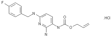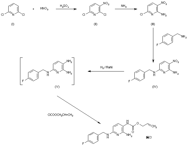 D-19050 can be obtained in a 5-step synthesis starting from 2,6-dichloropyridine (I): Compound (I) is nitrated with HNO3/H2SO4 yielding 2,6-dichloro-3-nitropyridine (II). Subsequent reaction with ammonia and 4-fluorobenzylamine leads to 2-amino-3-nitro-6-(4-fluorobenzylamino)pyridine (IV), which is hydrogenated using Raney Nickel as catalyst to the corresponding 3-amino derivative (V). This is not isolated, but reacted with (prop-1-en-3-yl)chloroformate to give D-19050.
