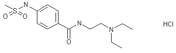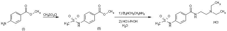 Reaction of p-aminobenzoic acid methyl ester (I) with methanesulfonyl chloride using pyridine as base provides the methanesulfonyl derivative (II). Heating (II) in heat N,N-diethyl-1,2-ethanediamine (III) at 140-50 C until complete disappearance of (II) gives the crude sematilide, which, after removal of excess diamine under vacuum, is crystallized as the hydrochloride salt from isopropanol/aqueous HCl.
