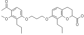 The reaction of 2,4-dihydroxy-3-n-propylacetophenone (I) with excess 1,3-dibromopropane in the presence of potassium carbonate in dimethylformamide gives 3-(2-n-propyl-3-hydroxy-4-acetylphenoxy)-1-bromopropane (II). Subsequent reaction of (II) with 2-carbomethoxy-7-hydroxy-8-n-propylchromone in dimethylformamide containing anhydrous potassium carbonate furnished 2-carbomethoxy-7-[5-(2-n-propyl-3-hydroxy-4-acetylphenoxy)propoxy]-8-n-propylchromone (III), m.p. 113-115 C. Hydrogenation of (III) in acetic acid with 5% palladium on carbon catalyst generated 2-carbomethoxy-7-[5-(2-n-propyl-3-hydroxy-4-acetylphenoxy)propoxy]-8-n-propylchroman (IV), m.p. 70-72 C. Subsequent alkylation of (IV) with excess methyl iodide in refluxing acetone containing anhydrous potassium carbonate produced O-methyl ester (V). Final hydrolysis of O-methyl ester (V) was carried out with lithium hydroxide in aqueous methanol to provide SC-41930.