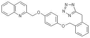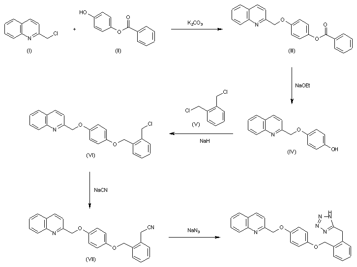 The condensation of 2-(chloromethyl)quinoline (I) with hydroquinone monobenzoate (II) by means of K2CO3 in refluxing acetone/DMF gives 4-(2-quinolylmethoxy)phenyl benzoate (III), which is treated with sodium ethoxide in ethanol to yield 4-(2-quinolylmethoxy)phenol (IV). The condensation of (IV) with alpha,alpha'-dichloro-o-xylene (V) by means of NaH in THF affords the benzyl chloride derivative (VI), which is treated with NaCN in toluene/water with a phase-transfer catalyst to provide the benzyl cyanide derivative (VII). Finally, this compound is cyclized with sodium azide in hot DMF to afford the target tetrazole derivative.