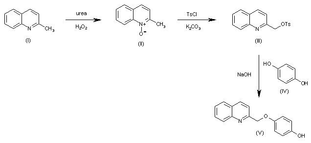 Synthesis of intermediate 4-(2-quinolinylmethoxy)phenol (V): The oxidation of 2-methylquinoline with urea and H2O2 in dichloromethane gives the N-oxide (II), which is treated with TsCl and K2CO3 in acetonitrile to yield the tosylate (III). Finally this compound is condensed with an excess of hydroquinone by means of NaOH in methanol/acetonitrile to afford the target intermediate (V).