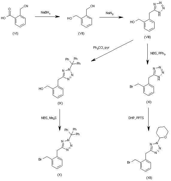 Synthesis of intermediate 5-[2-(bromomethyl)benzyl]-2-(triphenylmethyl)-2H-tetrazole (X): The reduction of 2-(cyanomethyl)benzoic acid (VI) with I2 and NaBH4 in THF gives 2-(cyanomethyl)benzyl alcohol (VII), which is cyclized with NaN3 and TEA in hot N-methylpyrrolidinone to yield 2-(1H-tetrazol-5-ylmethyl)benzyl alcohol (VIII). The reaction of (VIII) with trityl chloride and pyridine in dichloromethane affords the trityl protected compound (IX), which is finally brominated to the target intermediate (X) with NBS and Me2S in dichloromethane. Synthesis of intermediate 5-[2-(bromomethyl)benzyl]-2-(tetrahydropyran-2-yl)-2H-tetrazole (XII): The reaction of 2-(1H-tetrazol-5-ylmethyl)benzyl alcohol (VIII) with NBS and PPh3 in THF gives the 2-(1H-tetrazol-5-ylmethyl)benzyl bromide (XI), which is finally treated with dihydropyran (DHP) and pyridinium p-toluenesulfonate (PPTS) to yield the tetrahydropyranyl protected target intermediate (XII).