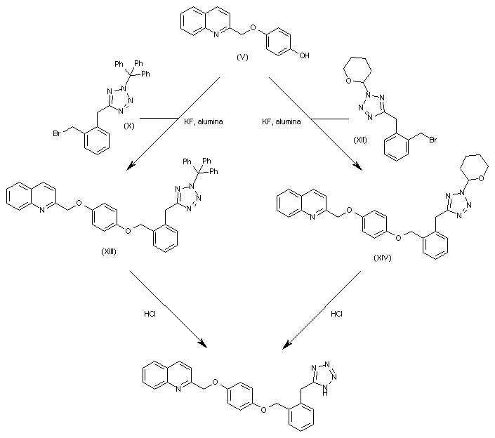 Synthesis of the target compound 147690: This compound has been obtained by two similar ways: 1. The condensation of intermediate 4-(2-quinolinylmethoxy)phenol (V) with intermediate 5-[2-(bromomethyl)benzyl]-2-(triphenylmethyl)-2H-tetrazole (X) by means of KF/alumina in acetonitrile gives the adduct (XIII), which is finally deprotected to the target compound by means of HCl in methanol/THF. 2. The condensation of intermediate 4-(2-quinolinylmethoxy)phenol (V) with intermediate 5-[2-(bromomethyl)benzyl]-2-(tetrahydropyran-2-yl)-2H-tetrazole (XII) by means of KF/alumina in acetonitrile gives the adduct (XIV), which is finally deprotected to the target compound by means of HCl in methanol/THF.