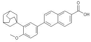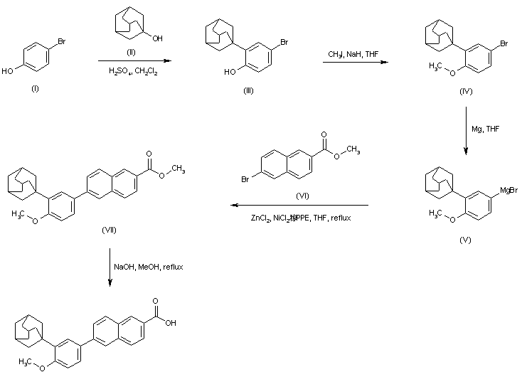 Friedel-Crafts condensation of 4-bromophenol (I) with 1-adamantanol (II) in the presence of H2SO4 yielded the adamantyl phenol (III). Subsequent alkylation of the sodium phenoxide of (III) with iodomethane produced the methyl ether (IV). The Grignard reagent (V), prepared from aryl bromide (IV), was converted to the organozincate derivative, and then subjected to a nickel-catalyzed cross-coupling with methyl 6-bromo-2-naphthoate (VI) to furnish adduct (VII). The target carboxylic acid was finally obtained by saponification of the methyl ester (VII).