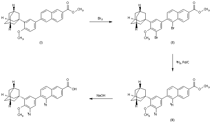 The bromination of 6-[3-(1-adamantyl)-4-methoxyphenyl]-2-naphthoic acid methyl ester (I) with Br2 in dichloromethane gives the dibromo derivative (II), which is hydrogenated with tritium gas over Pd/C in THF containing TEA to yield the bis tritiated ester (III). Finally, ester (III) is hydrolyzed with NaOH in refluxing methanol to afford the target tritiated naphthoic acid.