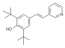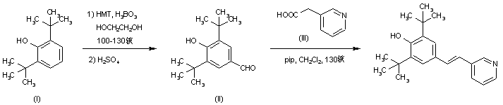 The reaction of 2,6-di-tert-butyllphenol (I) with hexamethylenetetramine (HMT) and sulfuric acid in ethyleneglycol at 130 C gives 4-hydroxy-3,5-di-tert-butylbenzaldehyde (II), which is finally condensed with 2-(3-pyridyl)acetic acid (III) by means of piperidine in dichloromethane at 130 C.