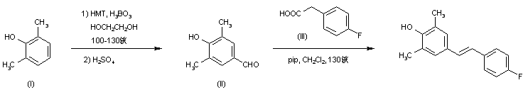 The reaction of 2,6-dimethylphenol (I) with hexamethylenetetramine (HMT) and sulfuric acid in ethyleneglycol at 130 C gives 4-hydroxy-3,5-dimethylbenzaldehyde (II), which is finally condensed with 2-(4-fluorophenyl)acetic acid (III) by means of piperidine in dichloromethane at 130 C.