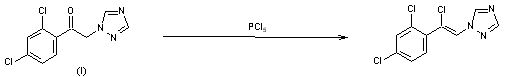 By halogenation of 1-(2,4-dichlorophenyl)-2-(1,2,4-triazol-1-yl)ethanone (I) with refluxing phosphorus pentachloride.