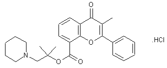 The chlorination of 2-phenyl-3-methyl-4-oxo-4H-1-benzopyran-8-carboxylic acid (I) with thionyl chloride gives the corresponding chloride (II), which is esterified with 1,1-dimethyl-2-(1-piperidinyl)ethanol (IV), obtained by alkylation of excess piperidine (III) with 1-chloro-2-methyl-2-propanol. Rec 15/2053 is obtained as the hydrochloride.