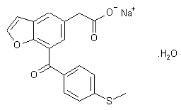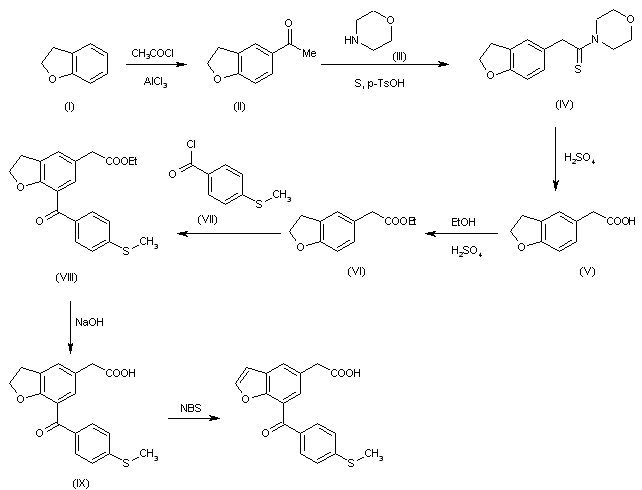 The acylation of 2,3-dihydrobenzofuran (I) with acetyl chloride and AlCl3 in dichloromethane gives 5-acetyl-2,3-dihydrobenzofuran (II), which by reaction with sulfur, morpholine (III) and p-toluenesulfonic acid at high temperature yields 2-(2,3-dihydrobenzofuran-5-yl)thioacetic acid morpholide (IV). The hydrolysis of (IV) with H2SO4 in refluxing water-acetic acid affords 2-(2,3-dihydrobenzofuran-5-yl) acetic acid (V), which is esterified to (VI) with ethanol and H2SO4 in refluxing toluene. The condensation of the ester (VI) with 4-(methylthio)benzoyl chloride (VII) by means of SnCl4 in refluxing dichloromethane gives ethyl 2-[7-[4-(methylthio)benzoyl]benzofuran-5-yl]acetate (VIII), which by hydrolysis with NaOH in refluxing methanol-water yields the corresponding acid (IX). Finally, this compound is dehydrogenated with N-bromosuccinimide (NBS) and dibenzoyl peroxide in refluxing CCl4.