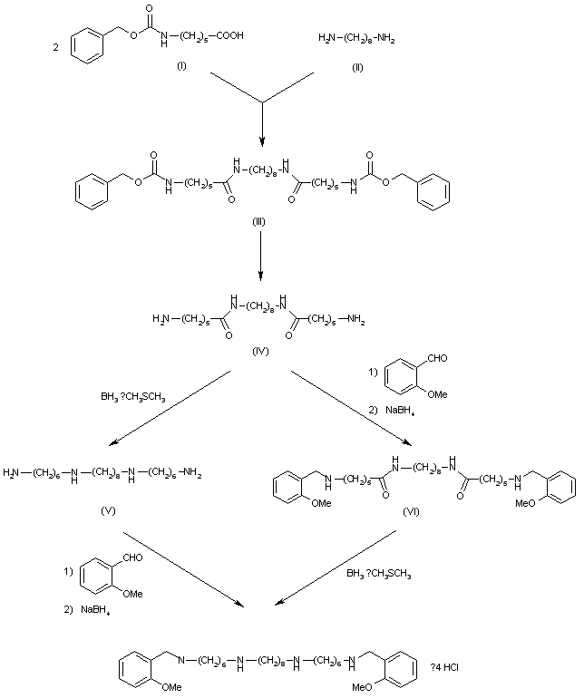 N-(Benzyloxycarbonyl)-6-aminocaproic acid (I) is reacted with 1,8-octanediamine (II) to give amide (III). The protecting group can be removed either by hydrogenolysis or by gaseous HBr affording (IV), which is reduced with borane-methyl sulfide complex to yield N,N'-bis(6-aminohexyl)-1,8-octanediamine (V). Condensation of (V) with 2-methoxybenzaldehyde and subsequent reduction of the intermediate Schiff base gives methoctramine. However, methoctramine can be prepared more conveniently by transforming (IV) to (VI) followed by reduction of amide groups with borane.