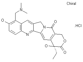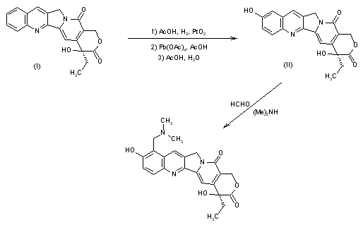 The reduction of camptothecin (I) with H2 over PtO2 in acetic acid, followed by oxidative acylation with lead tetraacetate and acetic acid and hydrolysis with acetic acid/water gives 9-hydroxycamptothecin (II), which is then treated with formaldehyde and dimethylamine in acetic acid. The hydrochloride salt is prepared by treatment of the acetic acid solution with diluted HCl.