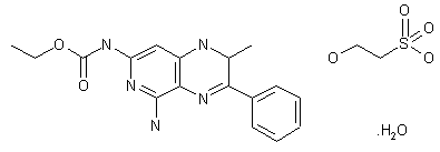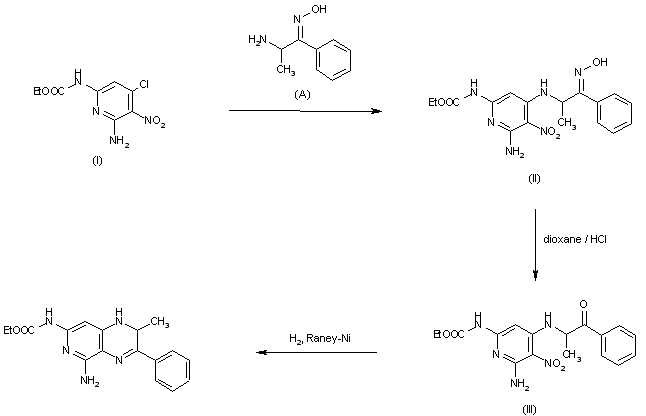 A number of 1-deaza-7,8-dihydropteridines with antimitotic activity have been prepared by the route shown in the scheme for NSC-350386 (1,2). Reaction of 2-aminopropiophenone oxime with ethyl 6-amino-4-chloro-5-nitropyridin-2-ylcarbamate (I) gave (II), which was hydrolyzed in a mixture of dioxane and hydrochloric acid to give the ketone (III). Reductive cyclization of (III) was effected with Raney Nickel and hydrogen.