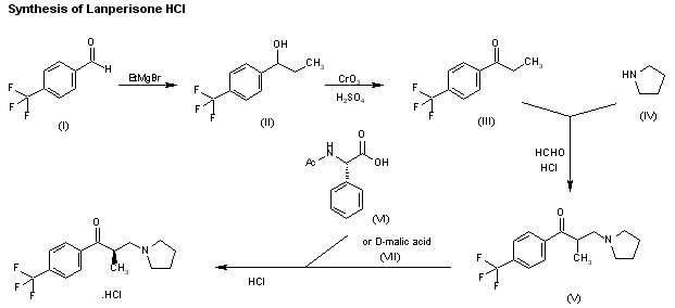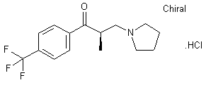 The Grignard reaction of 4-(trifluoromethyl)benzaldehyde (I) with ethylmagnesium bromide in ethyl ether gives 1-[4-(trifluoromethyl)phenyl]-1-propanol (II), which is oxidized with CrO3/H2SO4 yielding 4-(trifluoromethyl)propiophenone (III). The condensation of (III) with pyrrolidine (IV) and paraformaldehyde by means of HCl in refluxing isopropanol affords racemic 2-methyl-3-(1-pyrrolidinyl)propiophenone (V), which is finally submitted to optical resolution with N-acetyl-L-phenylglycine (VI) or D-malic acid (VII) and treated with dry HCl gas.