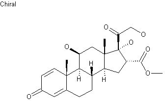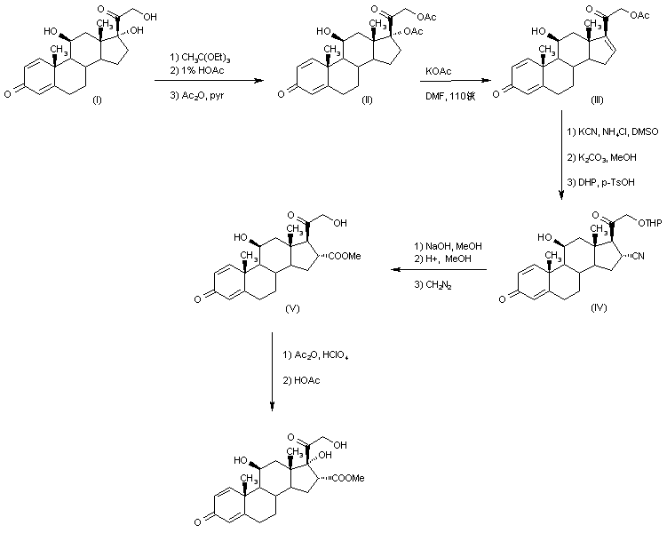 P16CM is synthesized from prednisolone (I) via the key 16,17-dehydro intermediate (III). The compound (III) is prepared by literature procedures from prednisolone by its conversion to prednisolone 17,21-diacetate (II), followed by a potassium acetate-induced acyloxy elimination reaction. Michael addition to (III) with KCN provides the 21-acetoxy-16alpha-cyano compound, which is deprotected at C-21 and reprotected with a base-stable tetrahydropyranyl (THP) group to provide (IV). A base hydrolysis of (IV), followed by deprotection at C-21 and esterification at the 16-carboxylate, gives (V), the 17-desoxy analogue of P16CM. 17alpha-Hydroxylation of (V) via the intermediate 17,20-enol acetate, using dilute peroxyacetic acid solution at low temperature, yields P16CM.