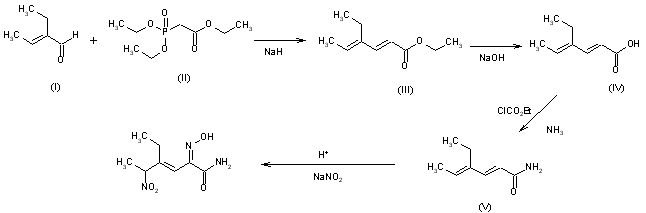 The Wittig condensation of 2-ethyl-2(E)-butenal (I) with triethyl phosphonoacetate (II) by means of NaH in benzene gives (2E,4E)-4-ethyl-2,4-hexadienoic acid ethyl ester (III), which is hydrolyzed with NaOH to the corresponding free acid (IV). The reaction of (IV) with ethyl chloroformate and then with ammonia affords the (2E,4E)-2-ethyl-2,4-hexadienamide (V), which is finally treated with NaNO2 in methanol adjusted at pH 3.0 with cond. HCl.