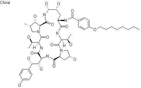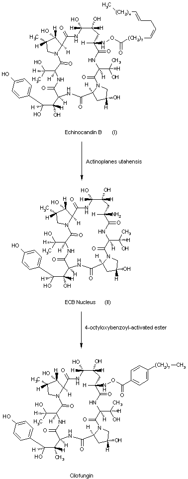 Cilofungin is a semi-synthetic anti-Candida agent that is derived from a three-step process: a) fermentation, isolation and purification of echinocandin B (ECB) (I) using an Aspergillus nidulans strain as the producing culture; b) deacylation of ECB by fermentation using an Actinoplanes utahensis culture to give the ECB nucleus (II); and c) N-acylation of the amino terminus of (II) using an activated ester of 4-octyloxybenzoic acid to give cilofungin.