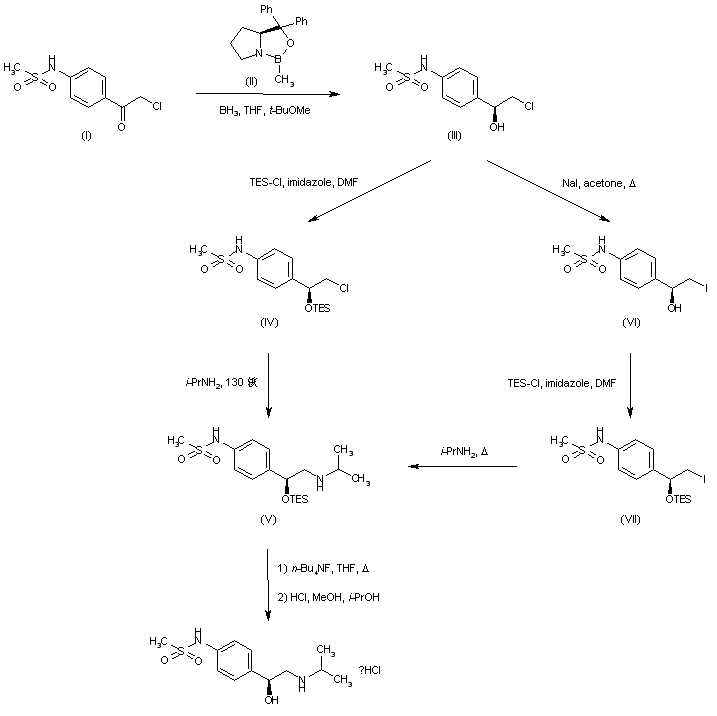 A chiral synthesis of d-sotalol has been reported starting from the commercially available 4'-(chloroacetyl)methanesulfonanilide (I). Enantioselective ketone reduction employing borane-tetrahydrofuran complex and (S)-2-methyloxazaborolidine (II) in tert-butyl methyl ether aforded the (S)-alcohol (III) with 96% e.e. Protection of the hydroxyl group as the triethylsilyl ether (IV) avoided formation of the undesired epoxide. Nucleophilic displacement of the chlorine of (IV) with isopropylamine to yield (V) was effected at 130 C in a pressurized steel bomb. Then, desilylation of (V) with tetrabutylammonium fluoride, followed by conversion to the hydrochloride salt furnished the title compound. In an improved procedure, chloride (III) was converted to the corresponding iodide (VI) by Finkelstein reaction with NaI in boiling acetone, followed by silylation with triethylsilyl chloride and imidazole to give (VII). Displacement of the iodine of (VII) to produce (V) was then feasible with refluxing isopropylamine at atmospheric pressure.
